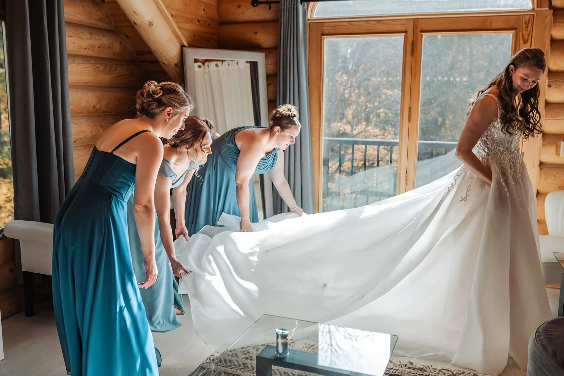 Meanwhile, the ladies were getting ready in the on-site log house, with Stacey Jensen and Lucky Beauty Bar perfecting their glam. Sara then slipped into her stunning L’amour bridal gown to complete her look.