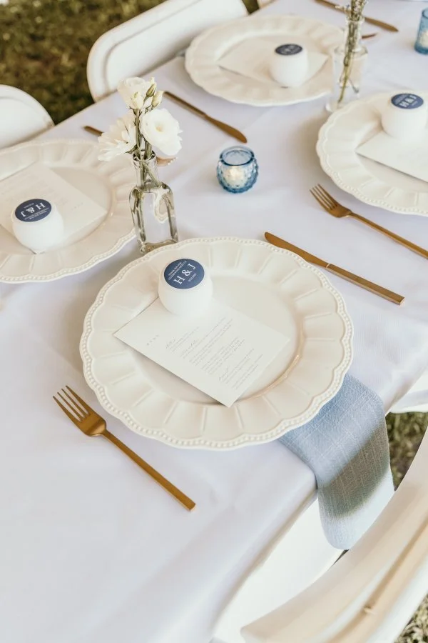 The reception decor matched the couple’s theme, consisting of bud vases with white flowers and light blue votives. The chargers, napkins, silverware, and plates were all provided by Apres. Big Bore Barbecue helped our team place the menu cards and a homemade candle wedding favor (made by the groom’s mom!) at each seat. So simple and elegant!