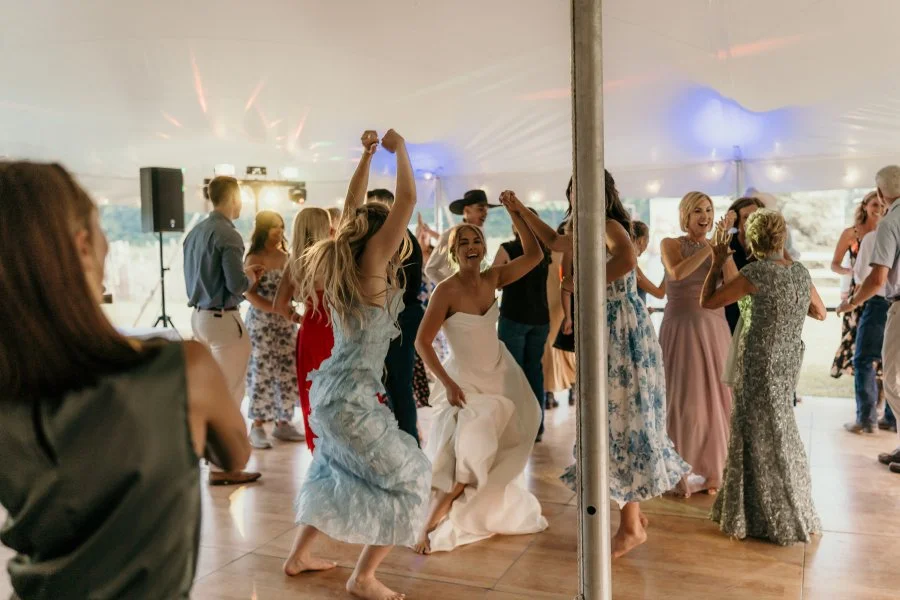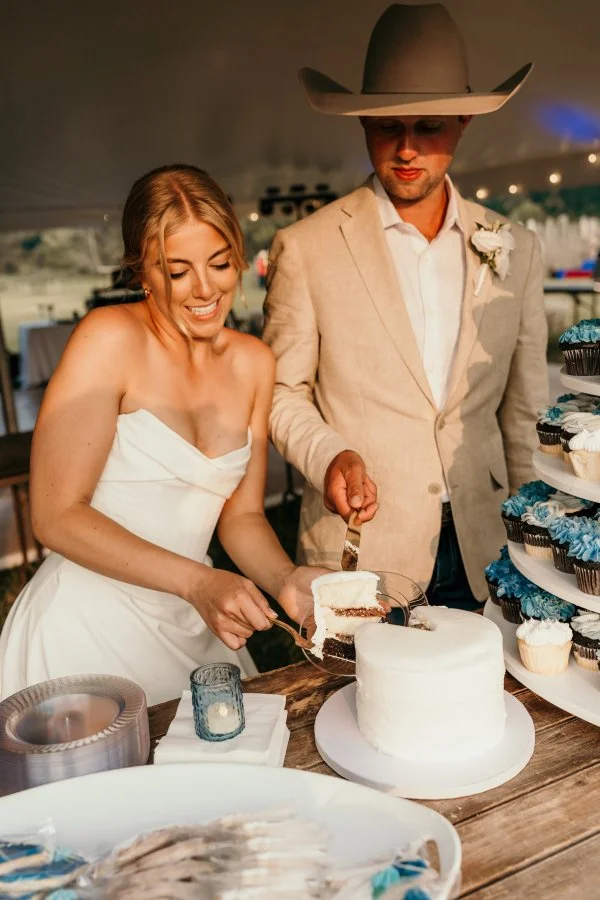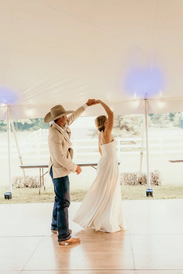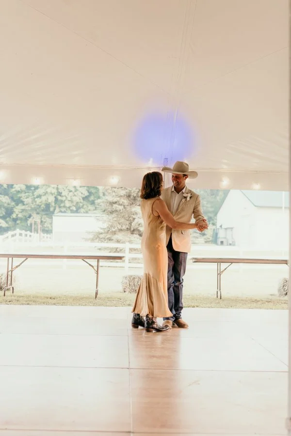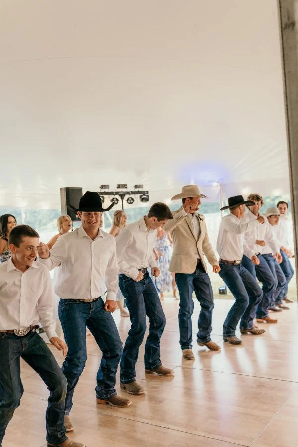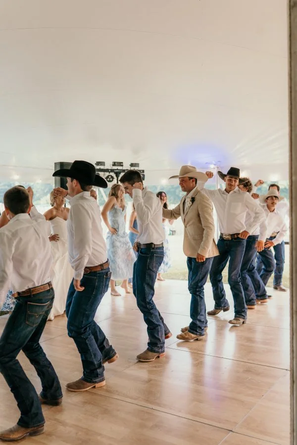 After a few special speeches from the couple, maid of honor, and best man, our team began sweeping the dance floor to get it ready. The bride and groom shared a first dance to “Forever and Always”, followed by the traditional parent dances. Jacob danced with his mom to “Mammas Don't Let Your Babies Grow Up to Be Cowboys,” which was so fitting for this crew!