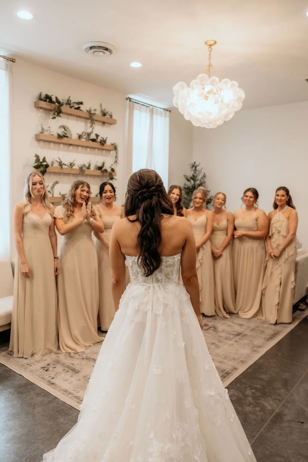 As soon as she finished getting dressed, she made her way out into the Primrose Suite for a first look with her bridesmaids. We love how their reactions went from pure love to hyping up their bestie!
