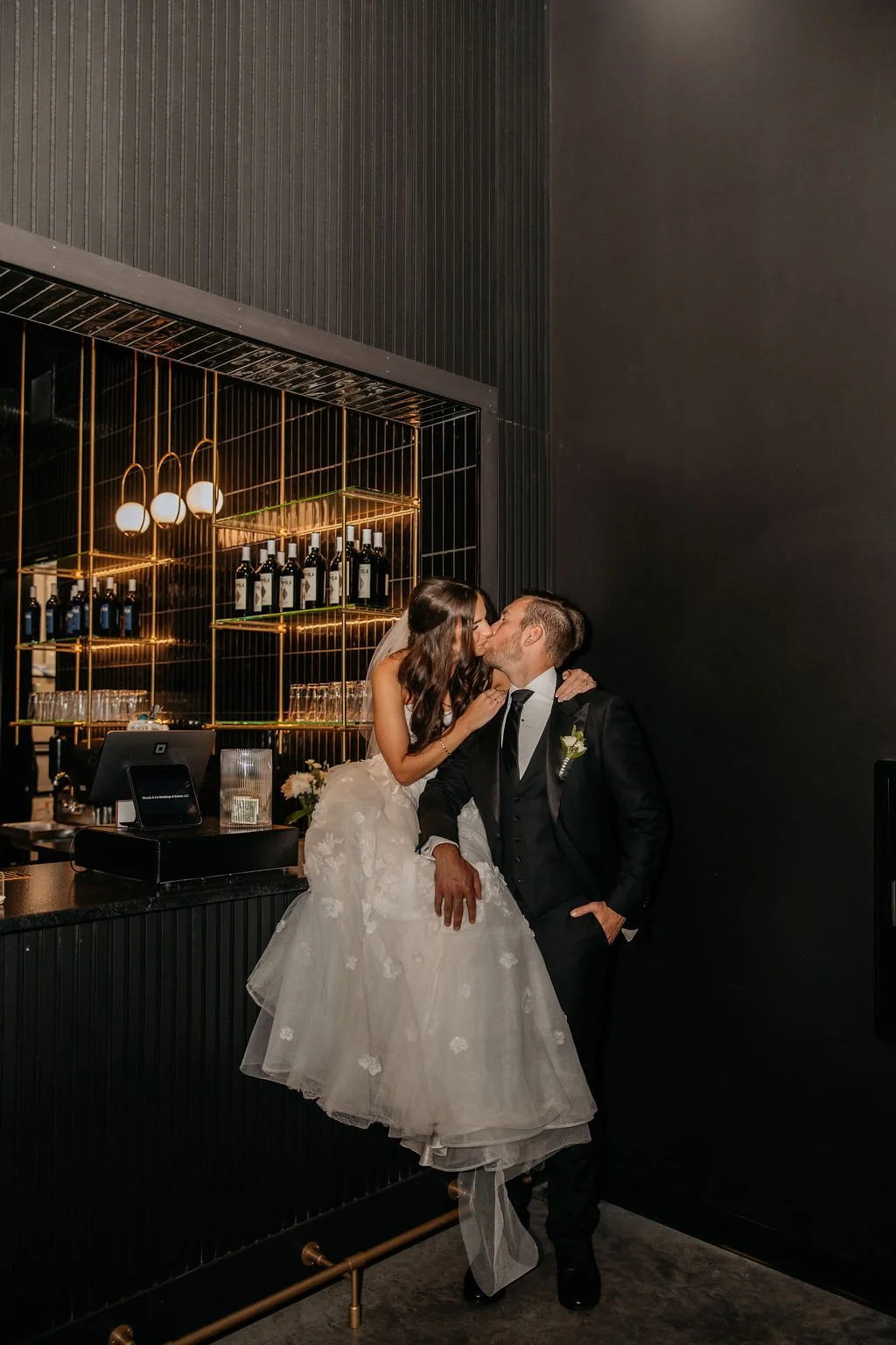 The reception unfolded in Woods & Co’s striking Glass House Reception Room. A Family Affair had set up the decor earlier that morning, which included an abundance of candles romantically lighting up the space. The greenery that the couple provided was a perfectly classic detail for the tablescapes!