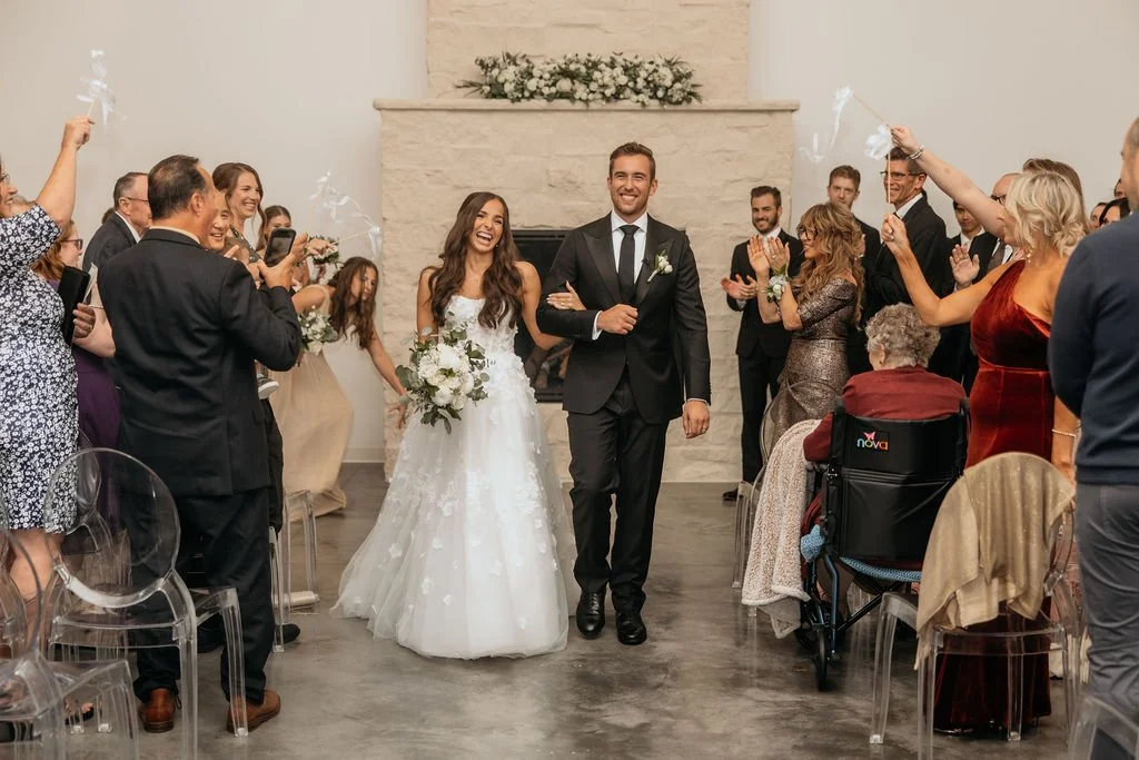 Once guests were re-seated inside, the wedding party re-entered, followed by the couple making their entrance together. While we always hope for clear skies, sometimes the unexpected adds its own kind of magic. We love to say rain on your wedding day is a sign of good luck. And in moments like this, it truly brings everyone closer as they rally together to celebrate the couple’s love, no matter the circumstances!